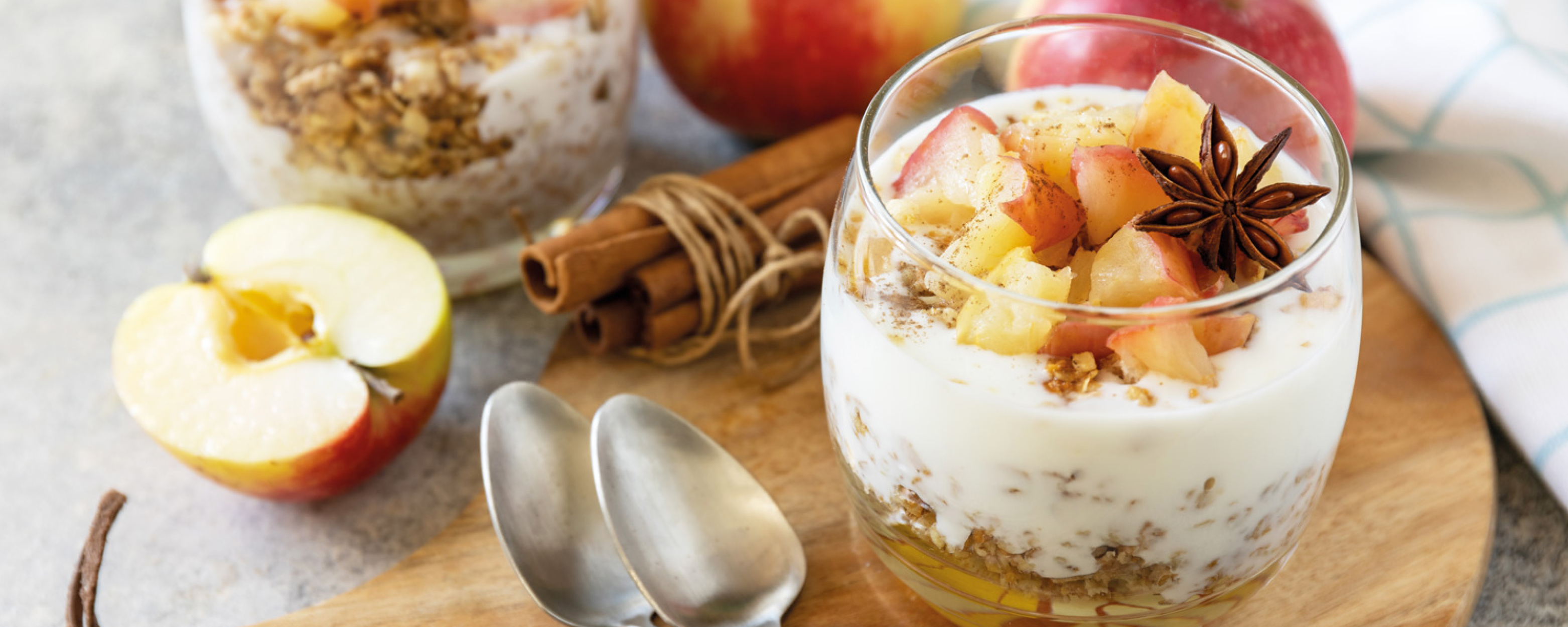 Doe de yoghurt in een kom, voeg de appel toe, bestrooi met kaneel en top af met noten of pitten.